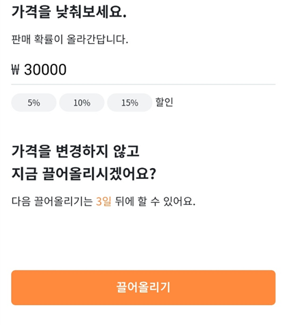 우선 자신이 판매할 물건을 당근마켓에 검색하여 중고 시세를 확인하는 게 선행되어야 합니다. 그 후에 빨리 판매하고 싶다면 시세보다 10% 낮은 가격에 올리는 방법도 좋겠죠. 그리고 상품을 올리고 사람들의 관심을 받지 못한다면 끌어올리기를 할 때 10%~20% 할인을 해보는 것도 좋은 방법입니다. 또는 제목 변경, 키워드 변경을 해주시면 지금과는 다른 사람들이 상품을 검색하게 됩니다.